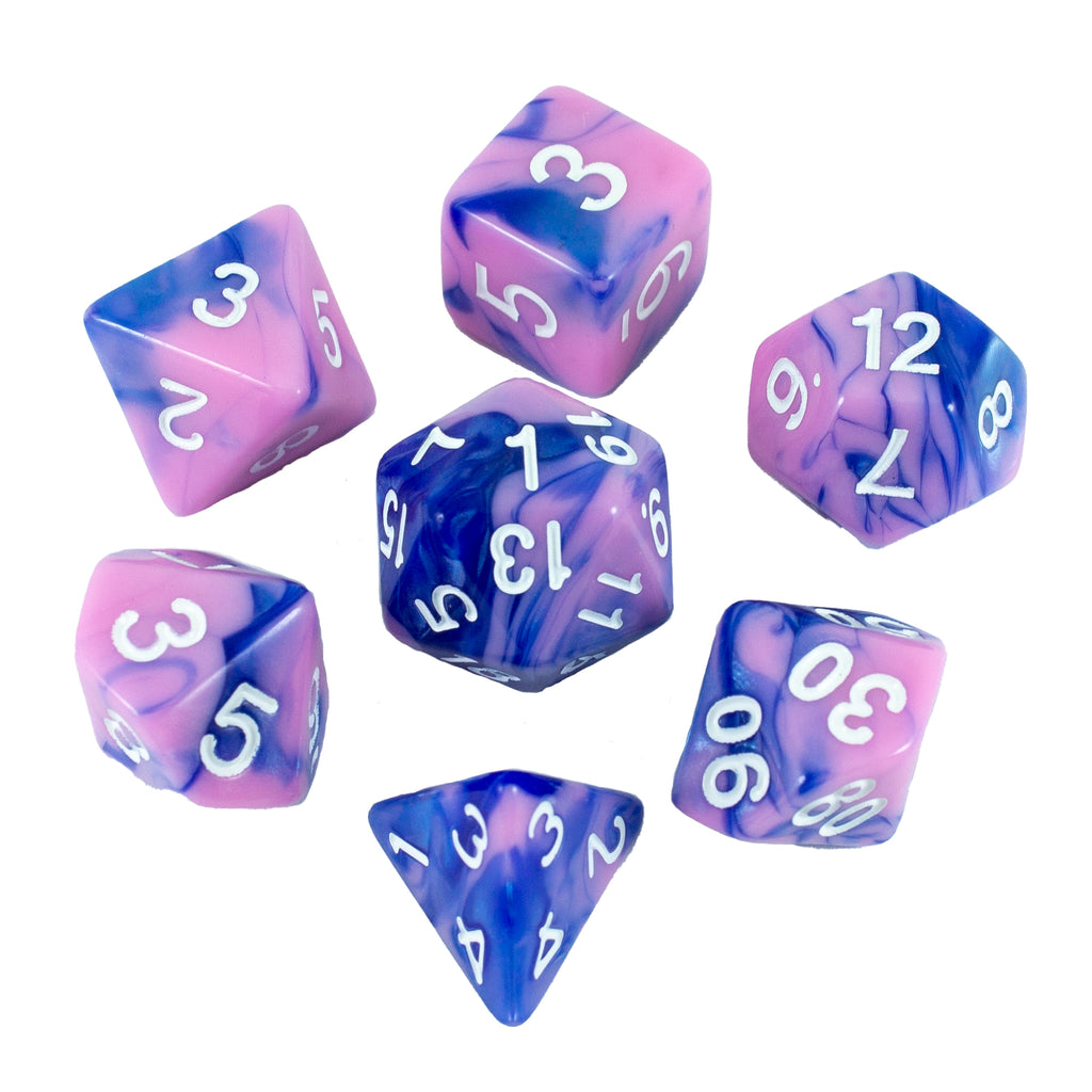 - Beautiful bi-colour rpg dice set, pink and blue marble effect with white numbering