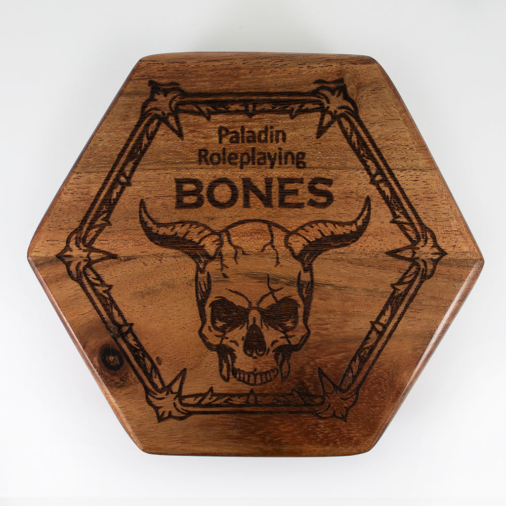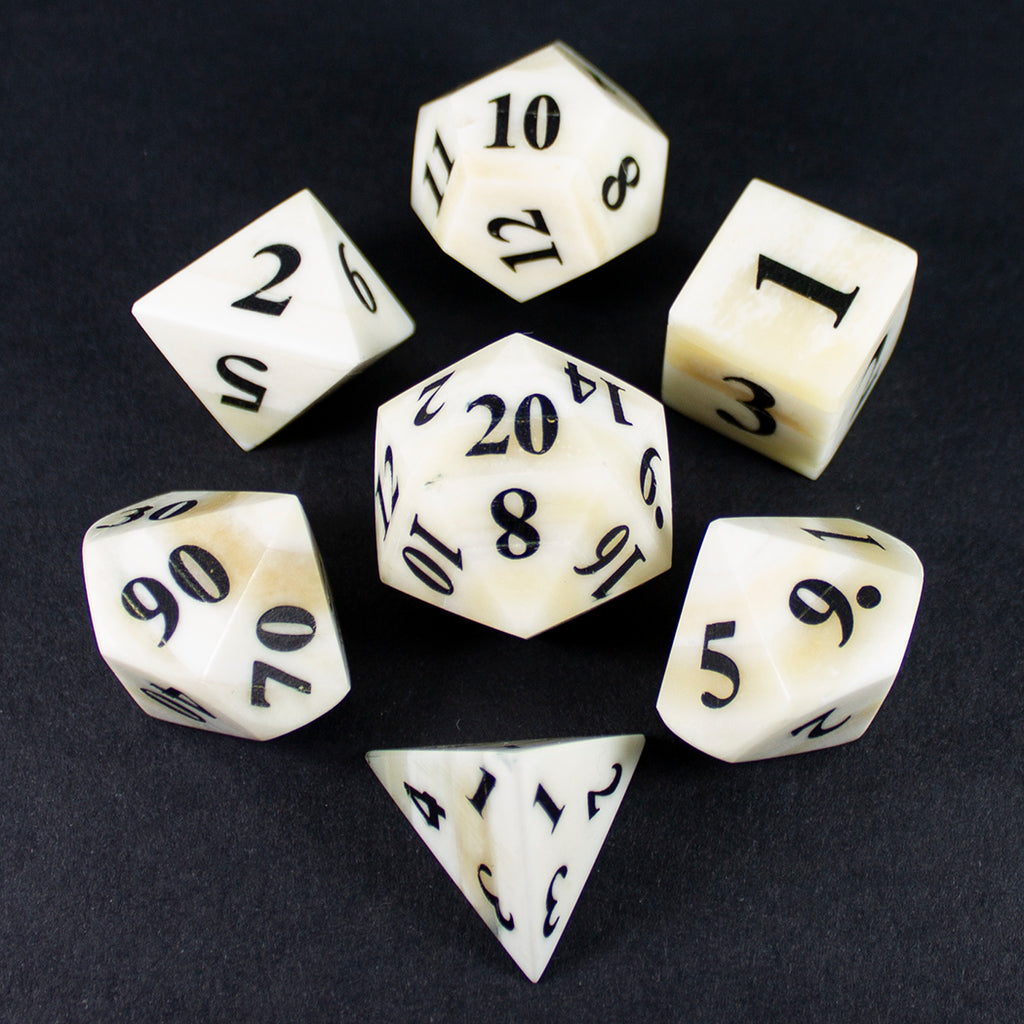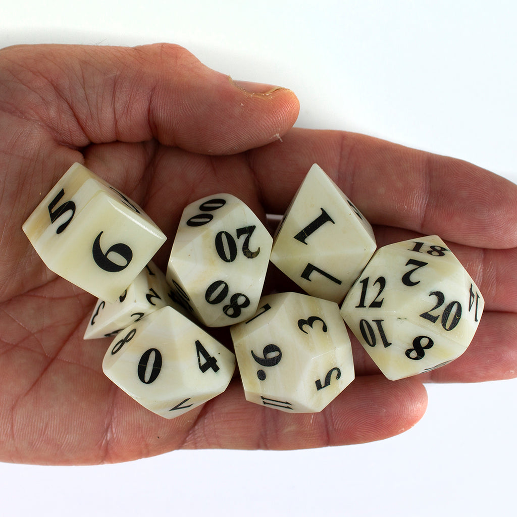 Solid Bone: Our brand new jumbo-sized dice made from buffalo bone. They look incredible and feel amazing to roll. They come in a solid wood presentation case. The D6 is 20mm across, and the D20 measures 28mm (over an inch!) from face to face.