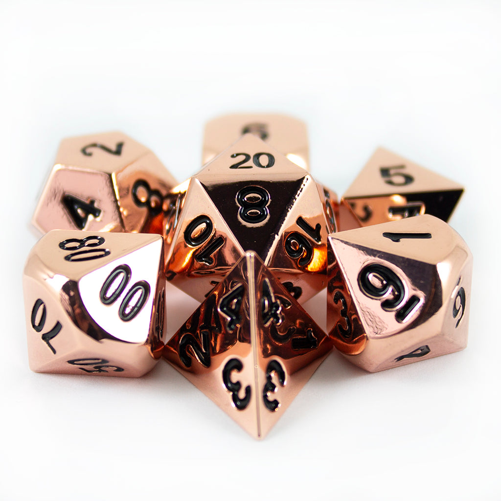 Copper Metal: Our classic metal dice, in a gorgeous copper colour, and polished up to a stunning shine. Hefty, solid, shiny, and beautiful. They come in a matching metal presentation tin.